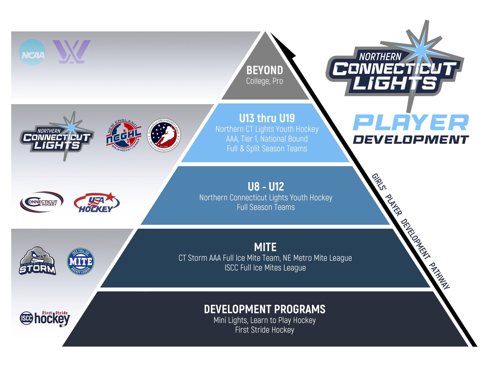 Players with the Northern CT Lights come from Connecticut, Western Massachusetts, NY and Rhode Island. Northern CT Lights teams compete at the highest level in state, regional and national play as members of the New England Girls Hockey League , Connecticut Hockey Conference and the Connecticut Girls Hockey League. However, the Northern CT Lights also provide multiple opportunities for girls who are looking for a less serious or more recreational commitment to participate in the sport of ice hockey.